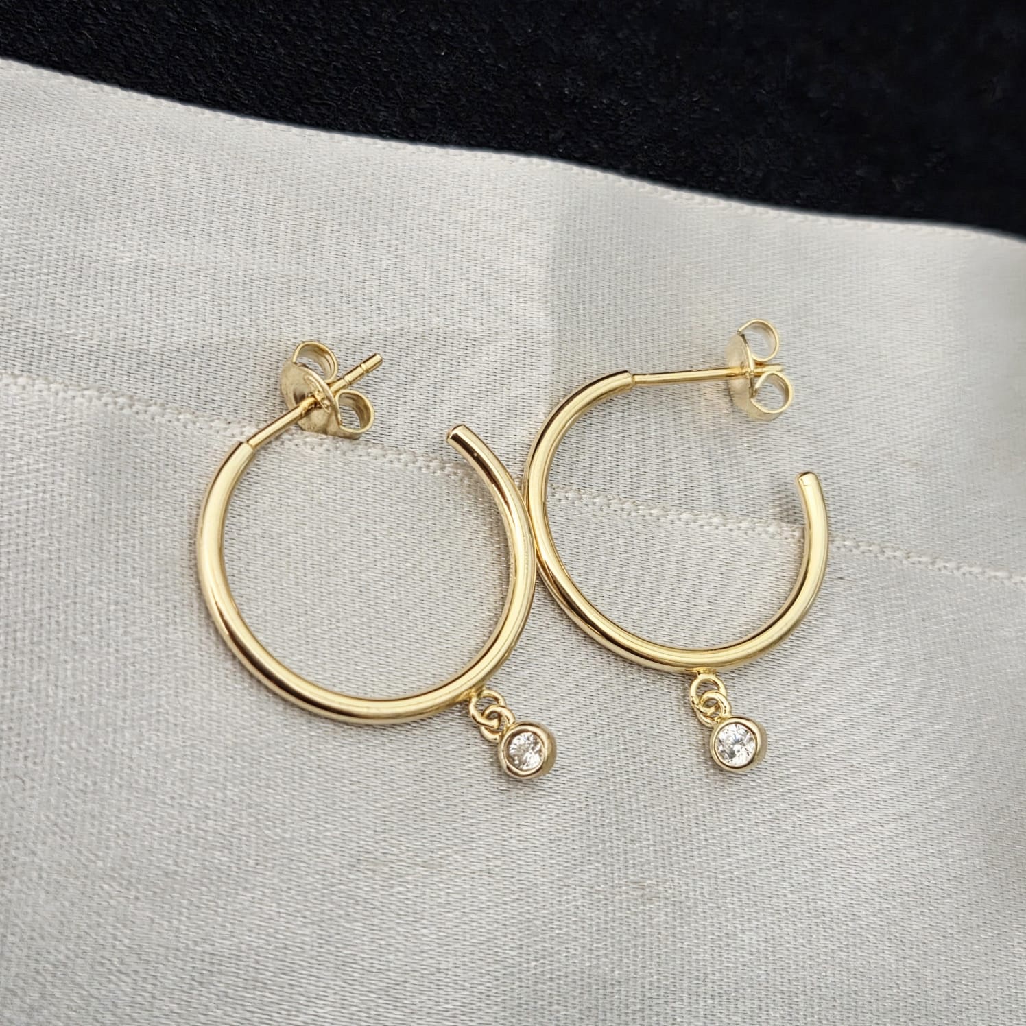 Sterling-Silver 925 gold plated hoop earrings with singular CZ stone drop detail.