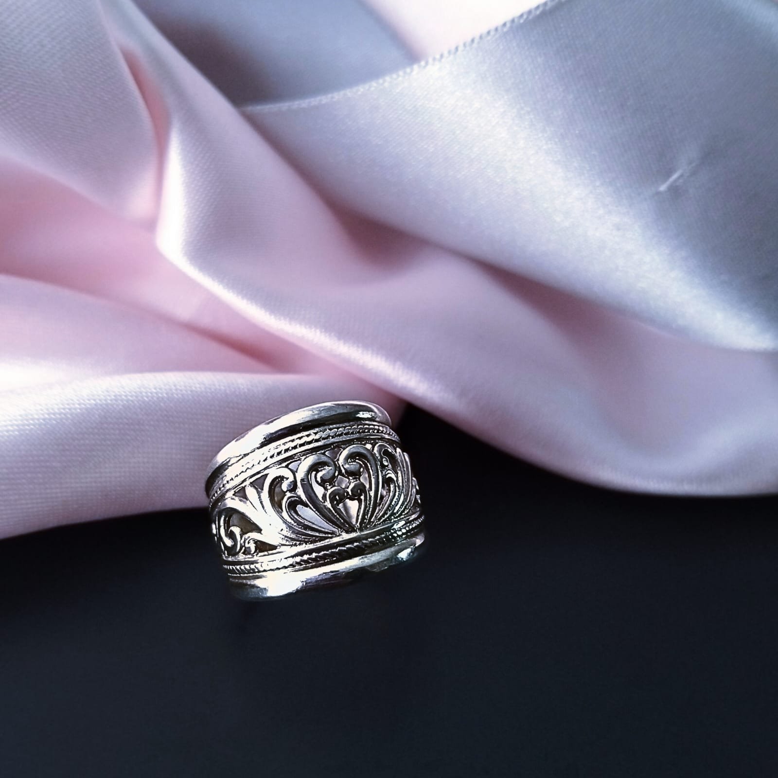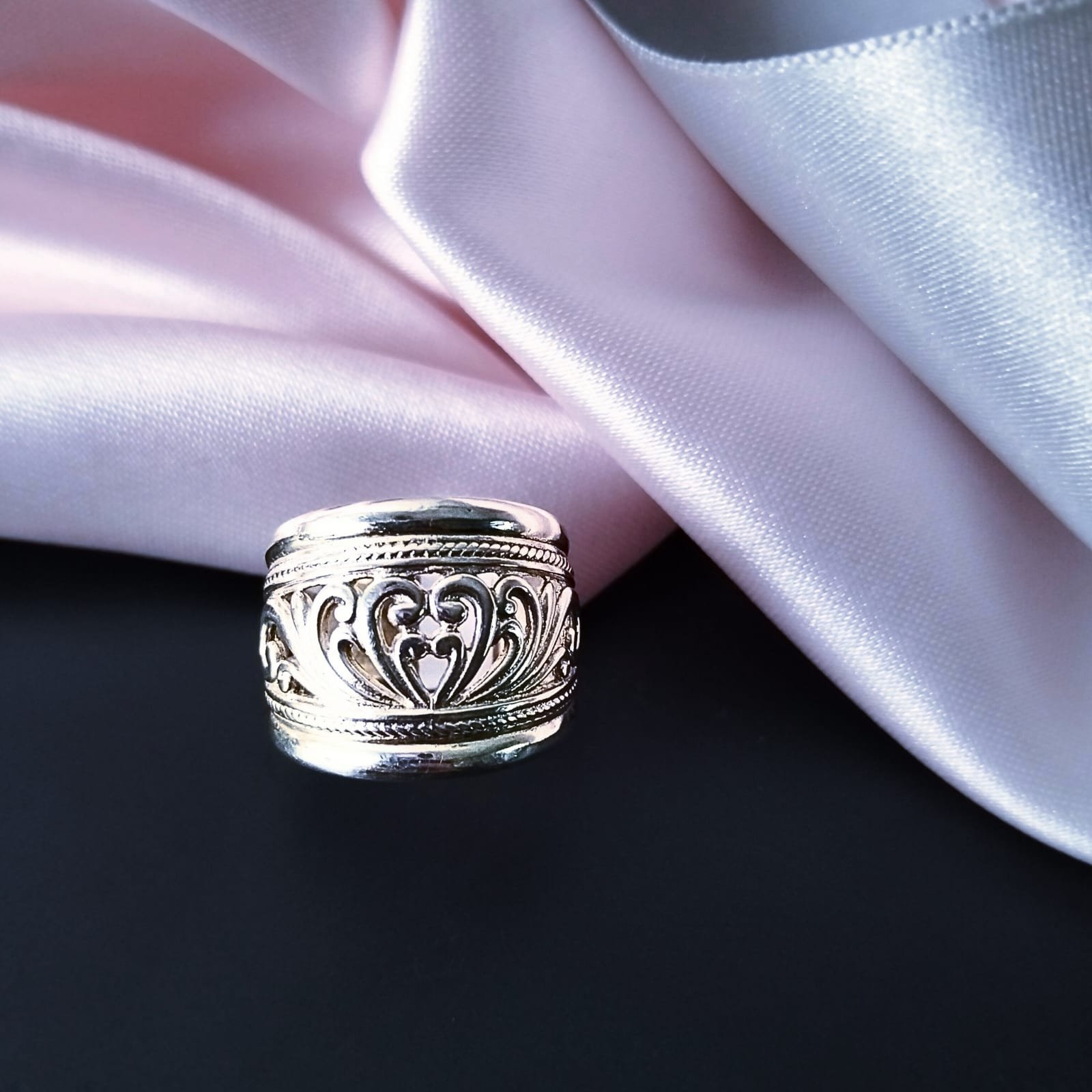 Ornate sterling-silver-925 ring with a wide band, with an intricate heart and scroll motif framed by delicate beaded edges, exuding vintage elegance.