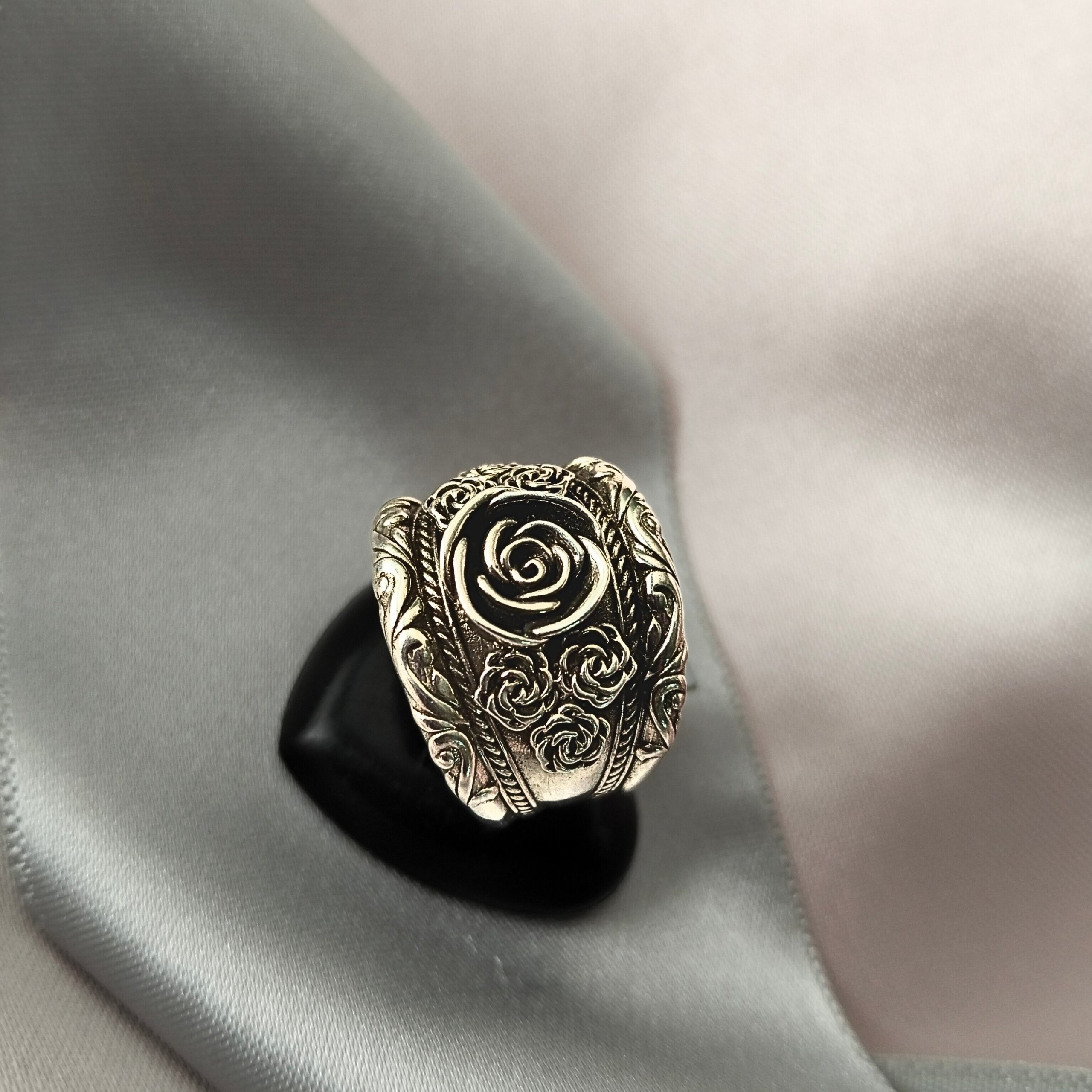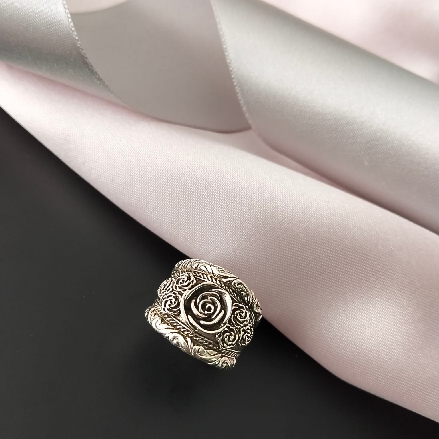 Wide sterling-silver-925 band ring with an central rose motif, surrounded by ornate scrollwork and engraved floral patterns for a vintage-inspired aesthetic.
