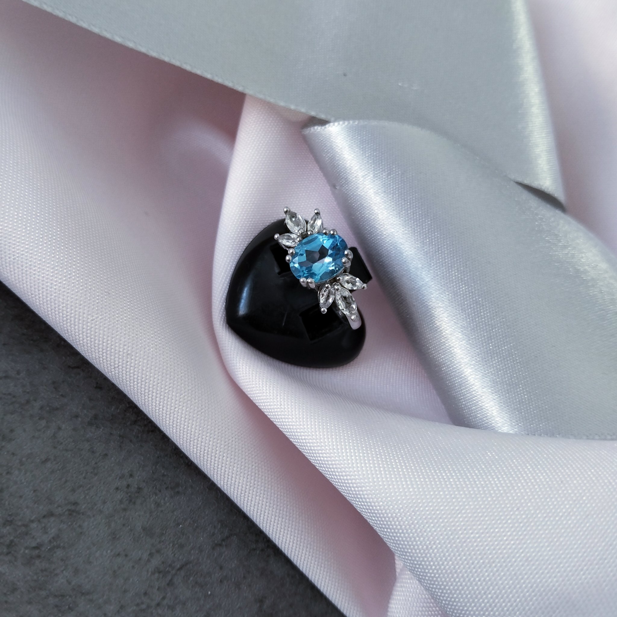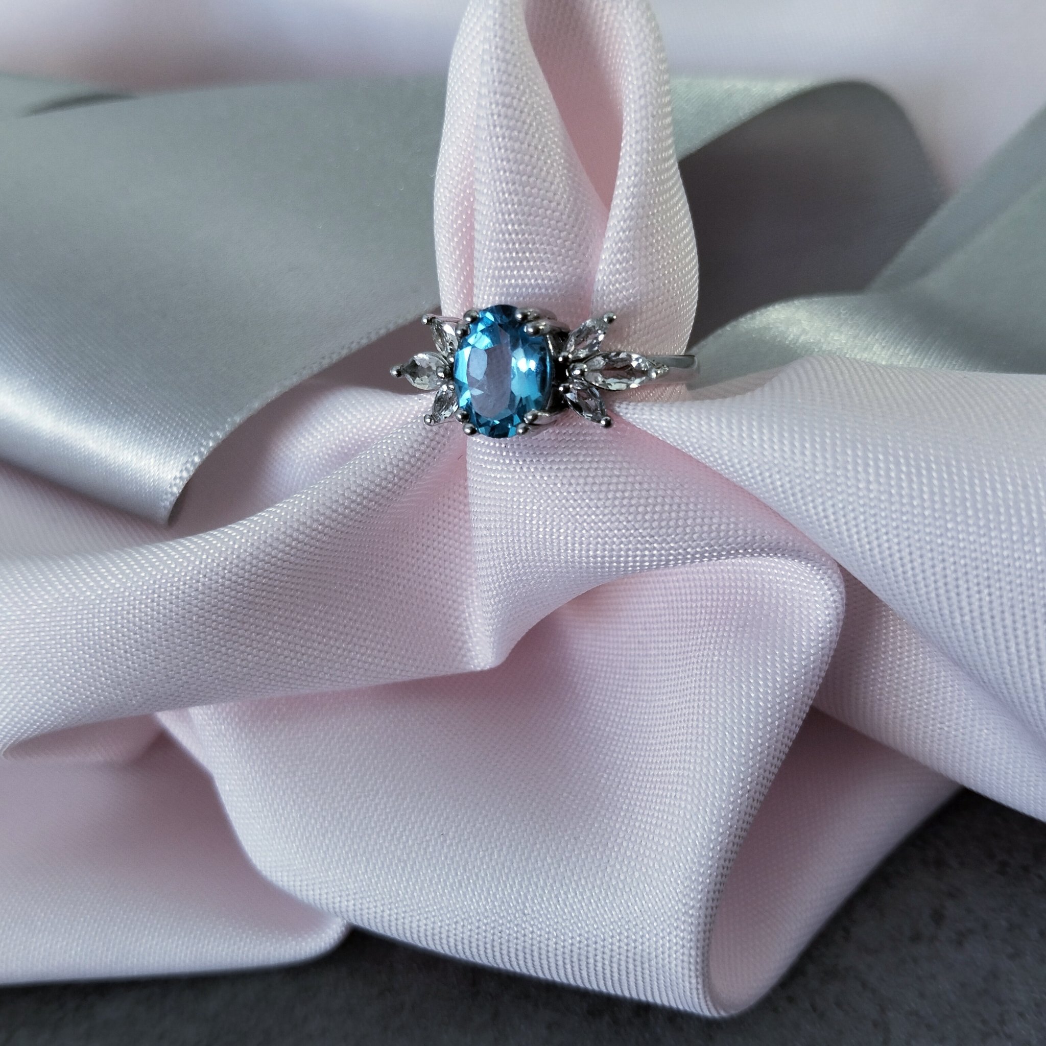 This is a sterling-silver-925 ring with a blue topaz gemstone as the center stone, flanked by smaller, clear cz stones, arranged in a leaf-like shape on either side of the main stone.