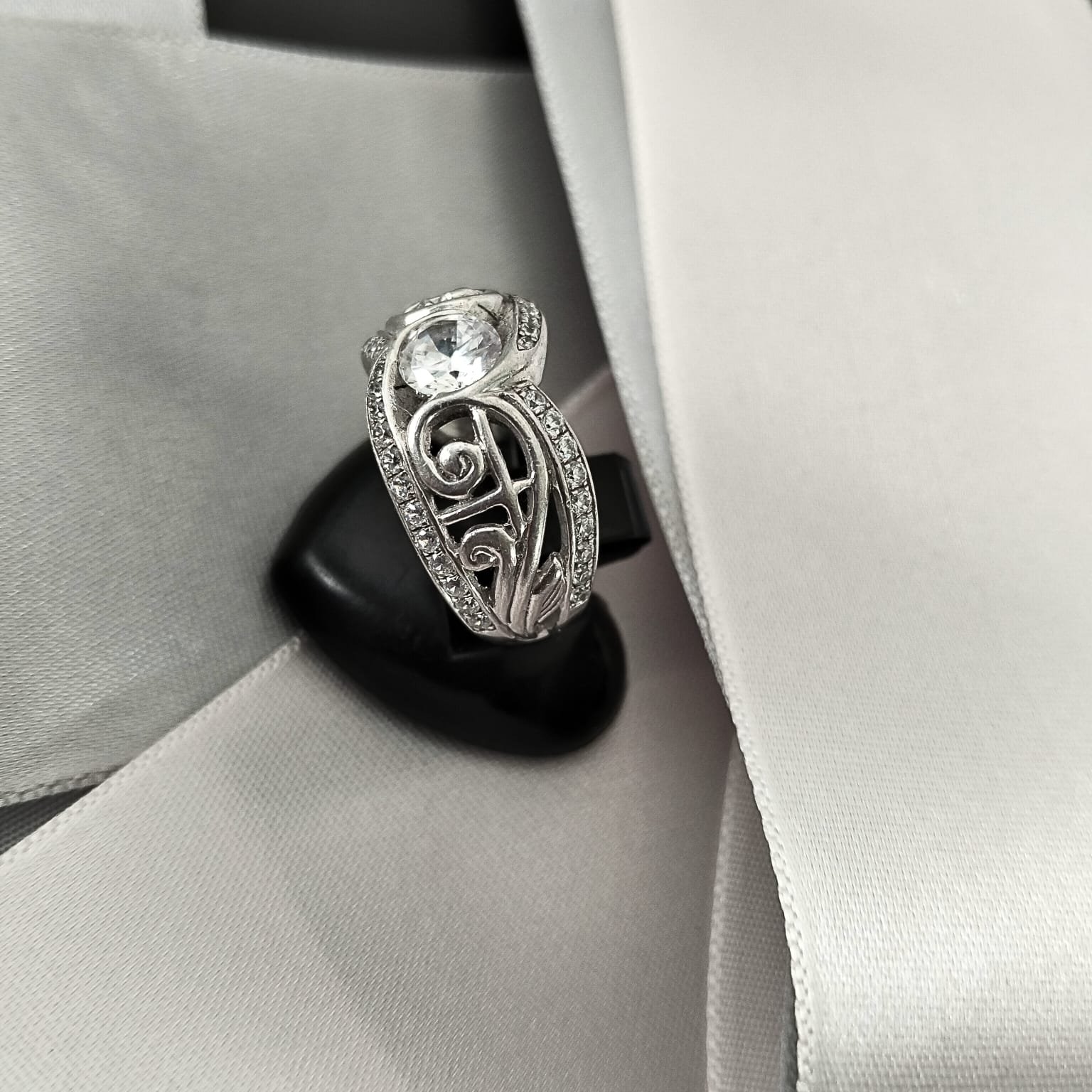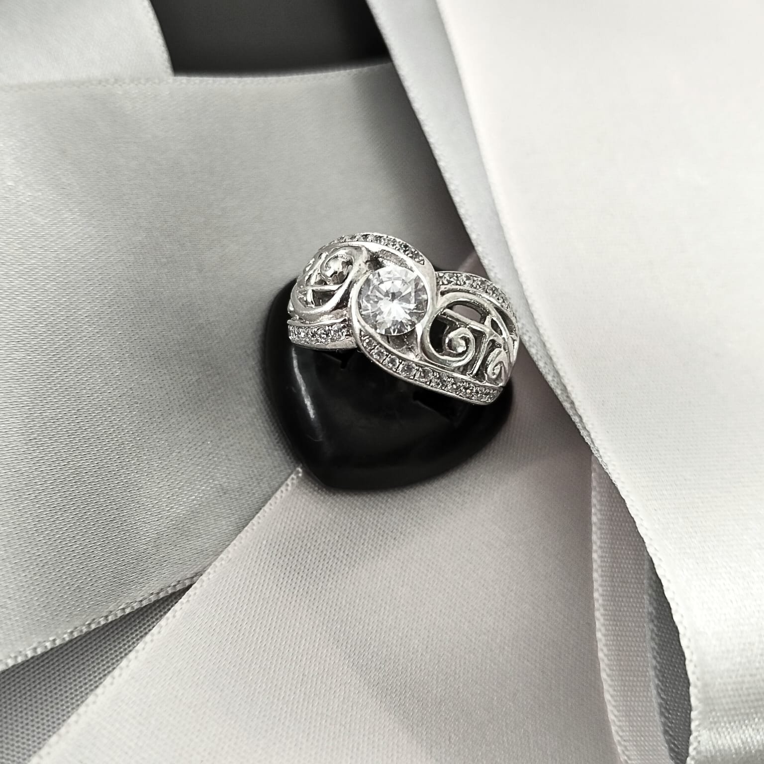 This is a sterling-silver-925 ring with a brilliant central cz stone and open work band.