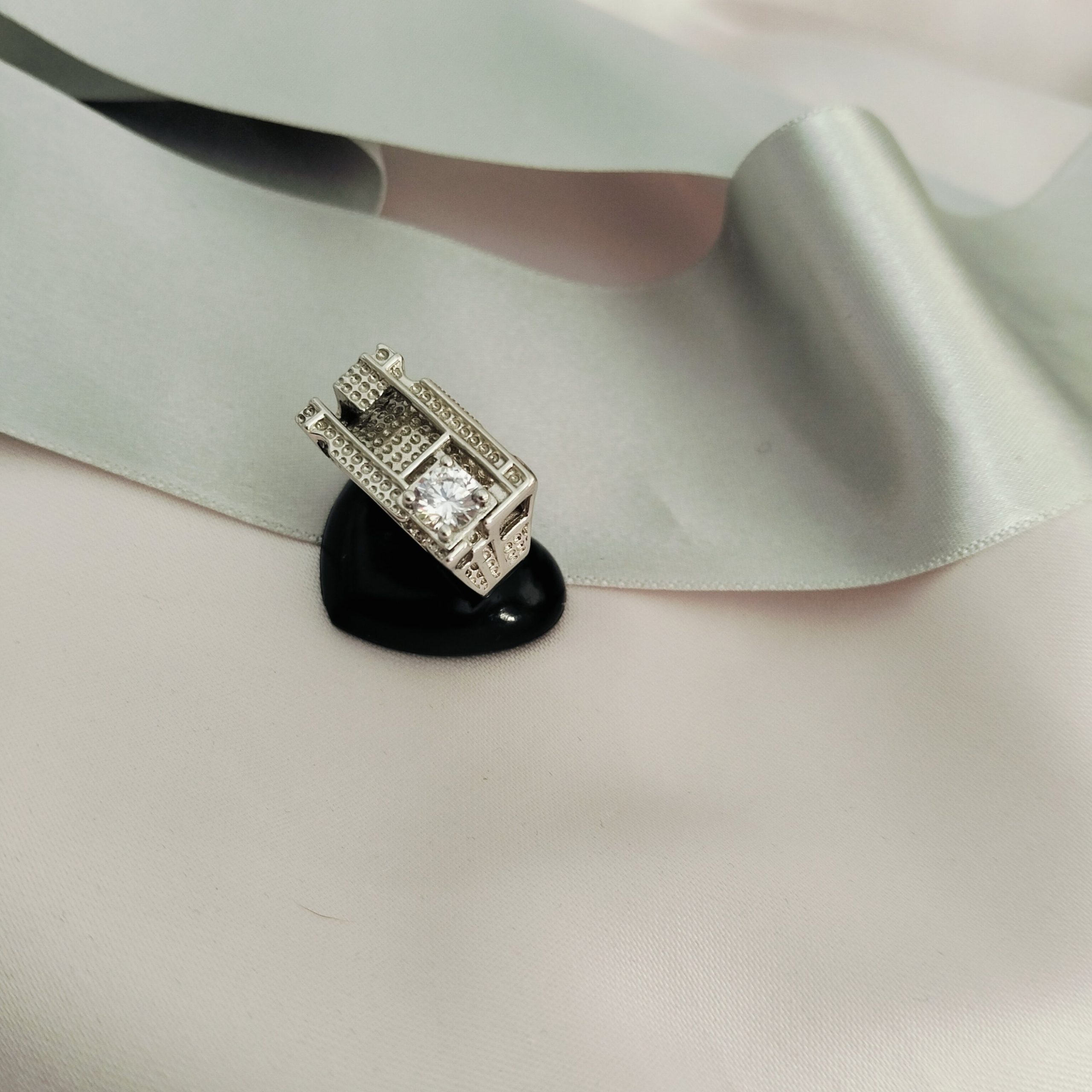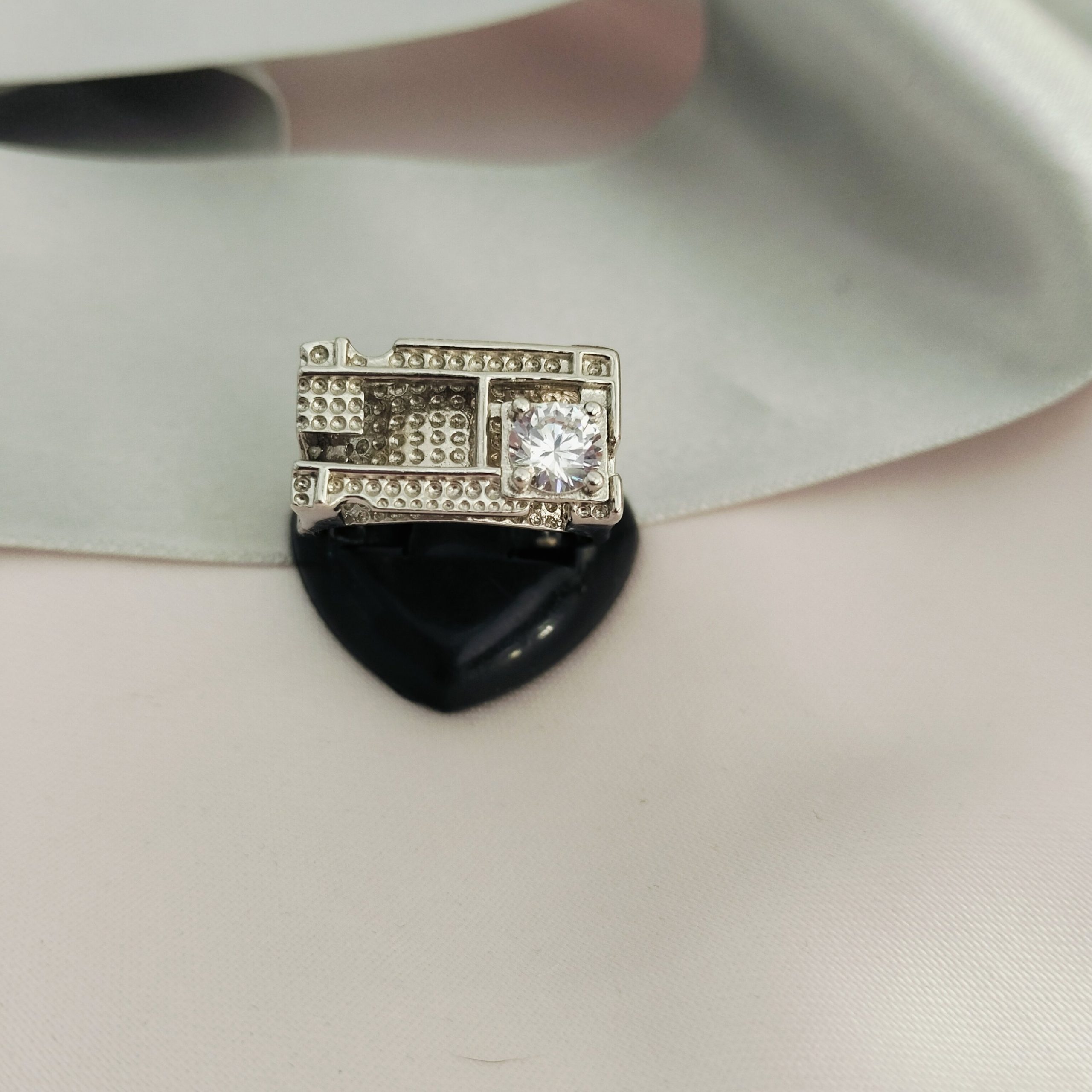 A silver-toned ring featuring a prominent central clear stone, a cubic zirconia set within a rectangular, possibly square, raised setting.