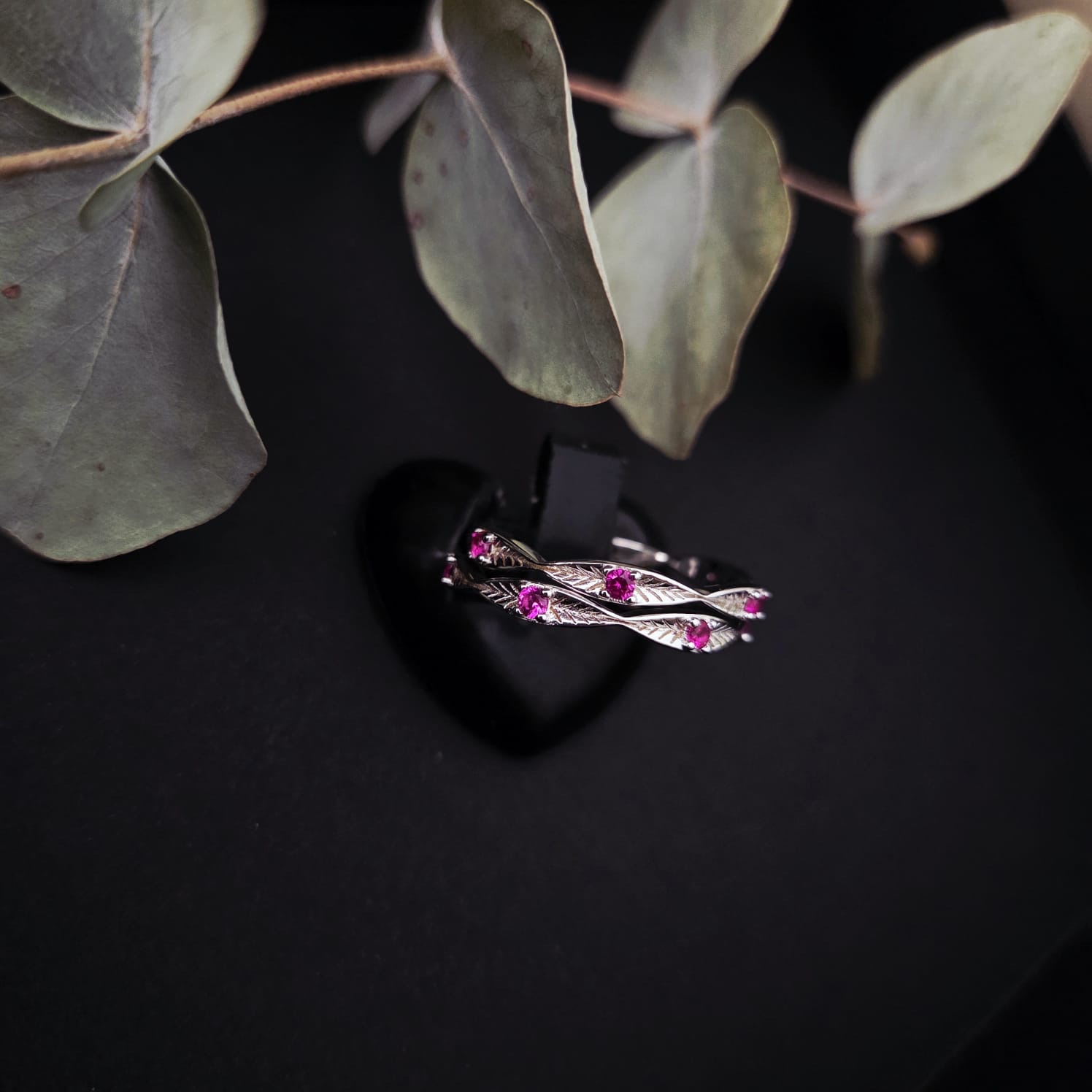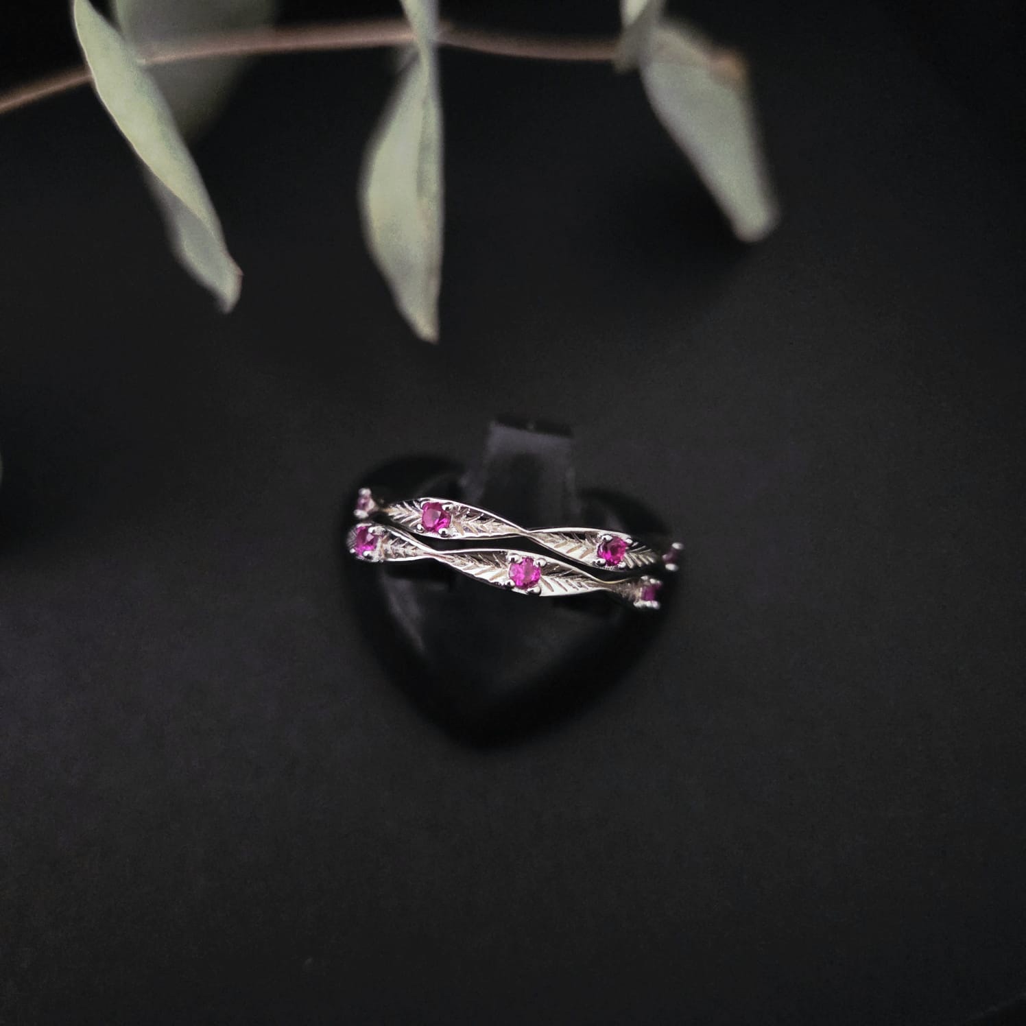 sterling-silver leaf band rings -925 with textured eternity design & pink CZ stones