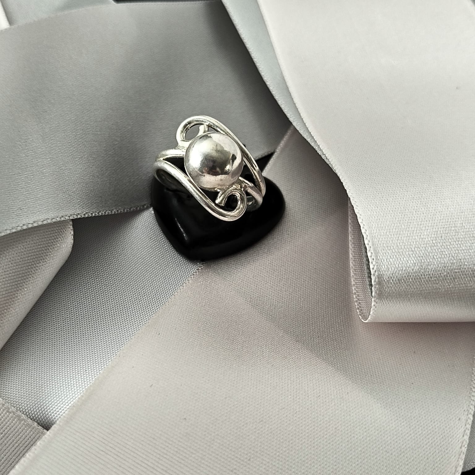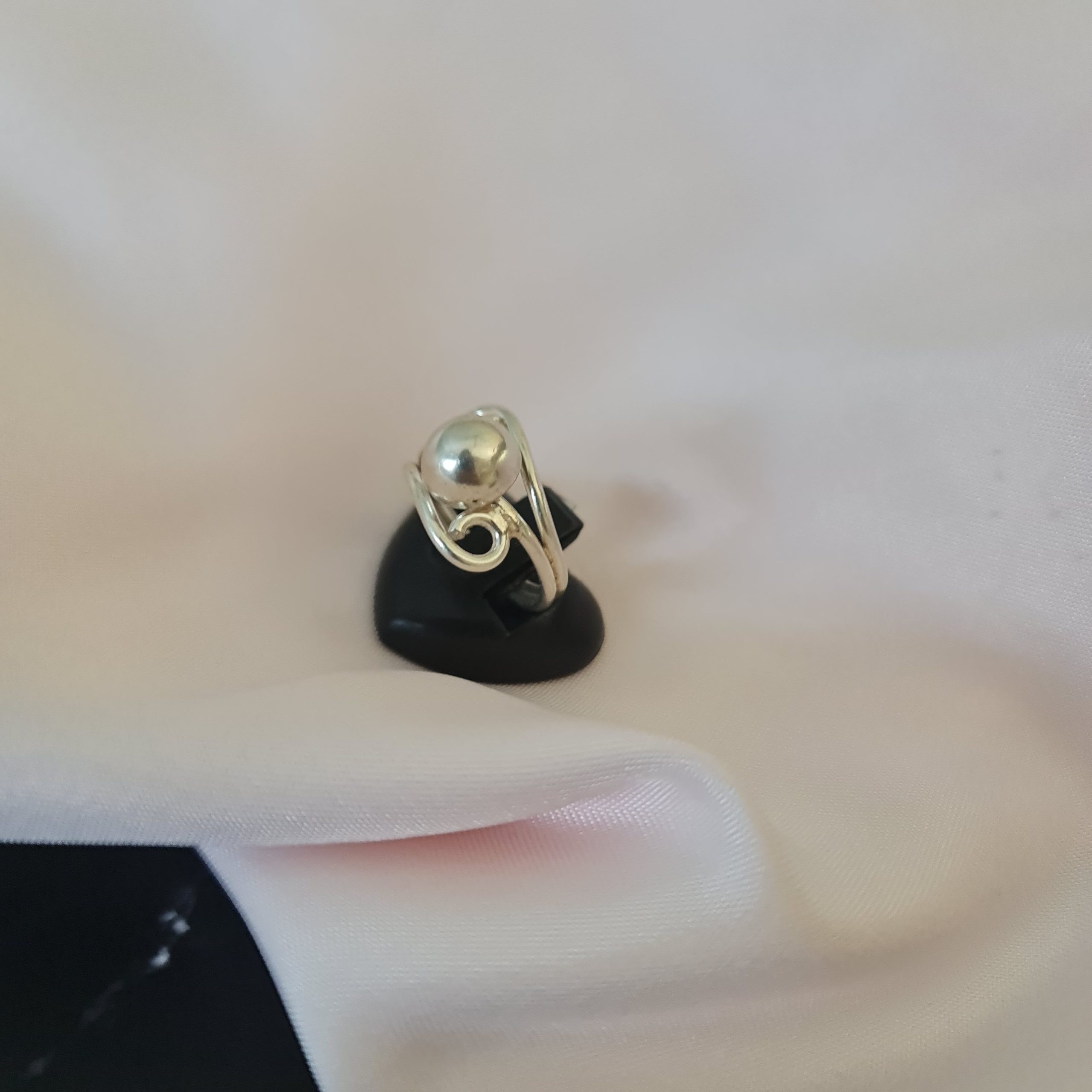 Elegant sterling-silver-925 ring with a smooth, polished silver bead centerpiece, embraced by graceful swirling wirework.