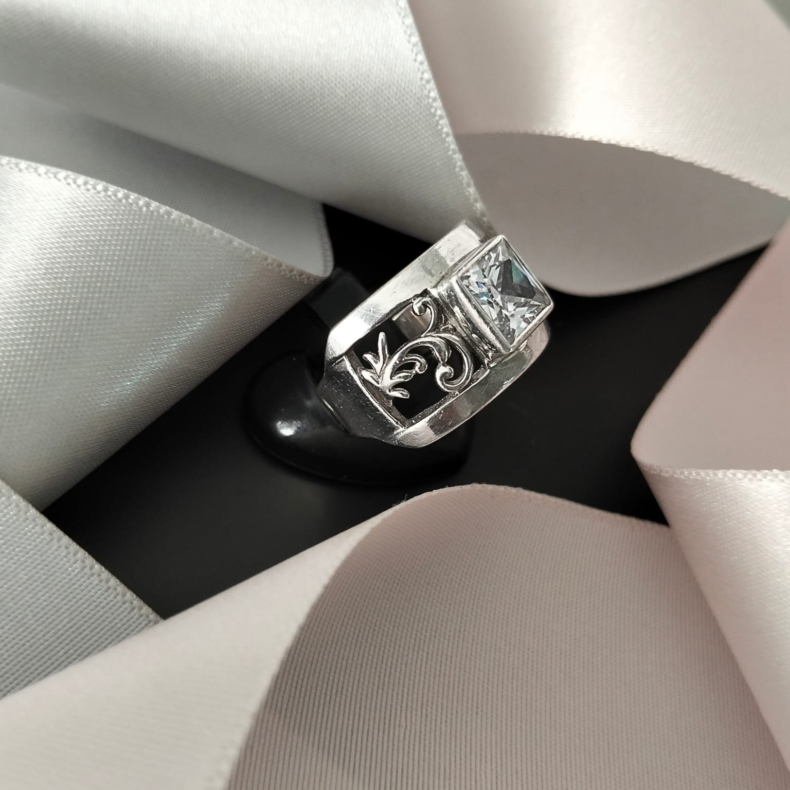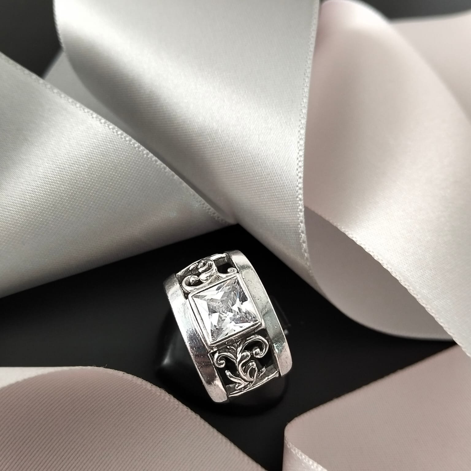 Bold sterling-silver-925 ring with a square-cut cz stone in a raised bezel setting, flanked by intricate openwork scroll designs.